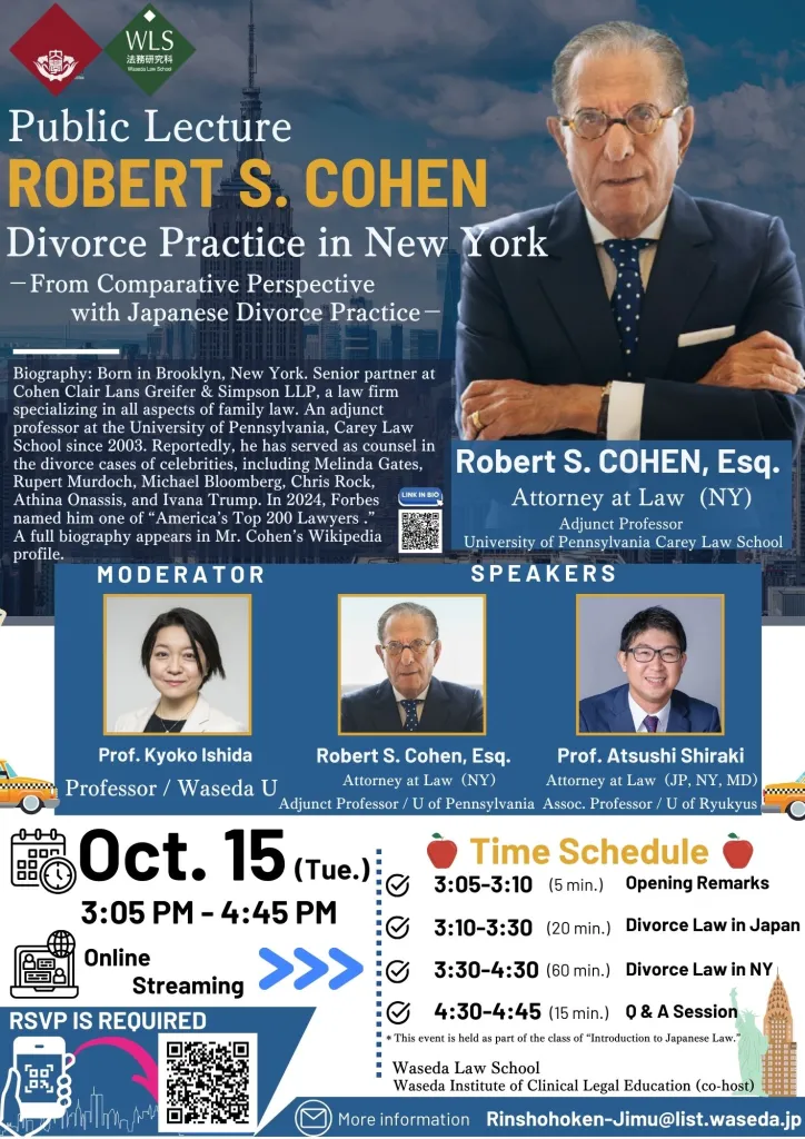 On Tuesday, October 15, 2024, at 3:05 PM, we will host Mr. Robert S. Cohen, Attorney at Law in New York State (Visiting Professor at the University of Pennsylvania), for a lecture titled “Practice of New York Family Law: A Comparison with Japan’s Divorce System” (hosted by the Waseda University Graduate School of Law, co-hosted by the Waseda University Institute for Clinical Legal Studies).